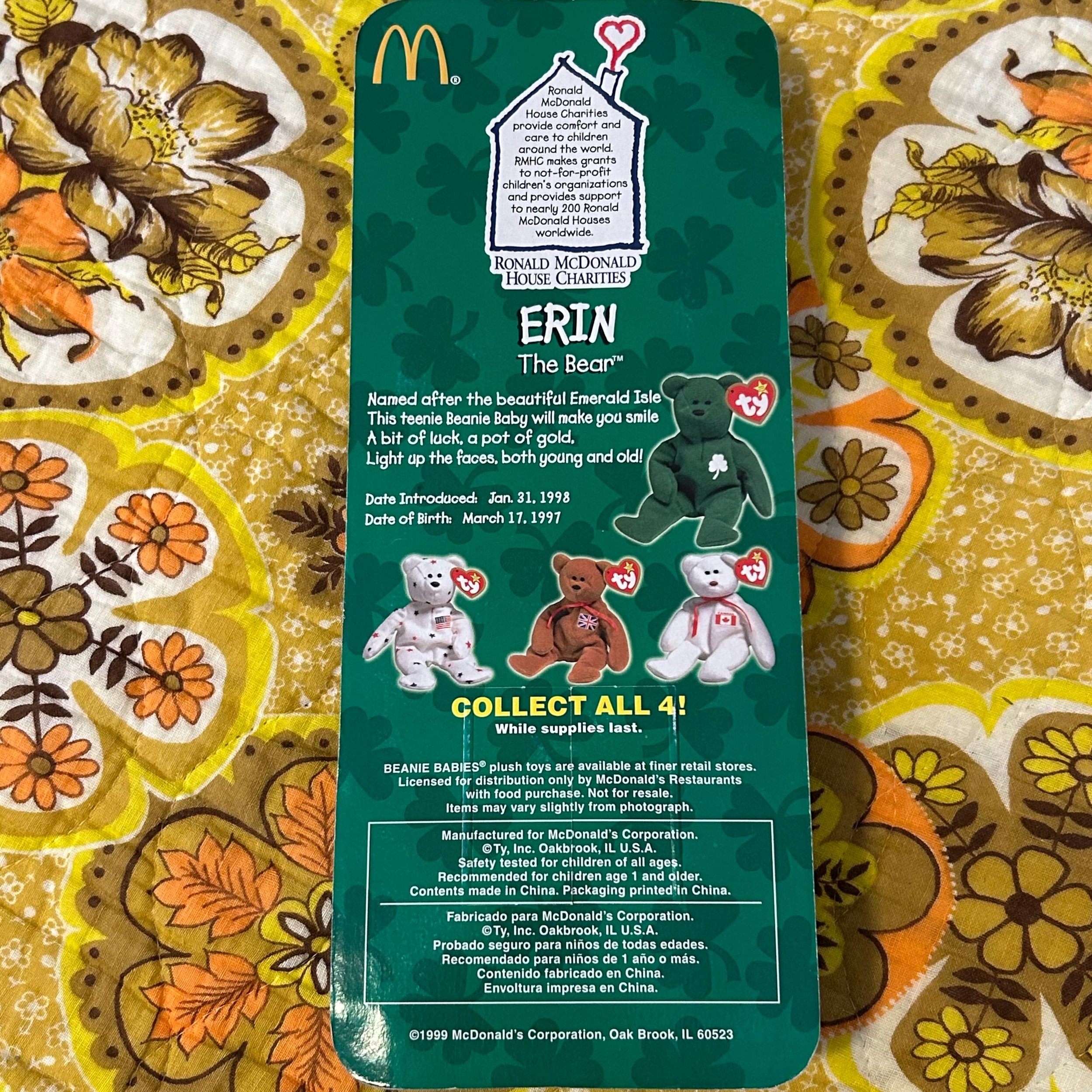 Brand new in package Erin the Bear Beanie Baby by TY! From the International Bears collection in collaboration with McDonald's from 1997. It is brand new and in great condition. Add it to your collection, gift it to a friend or loved one, or take it out and enjoy it yourself!