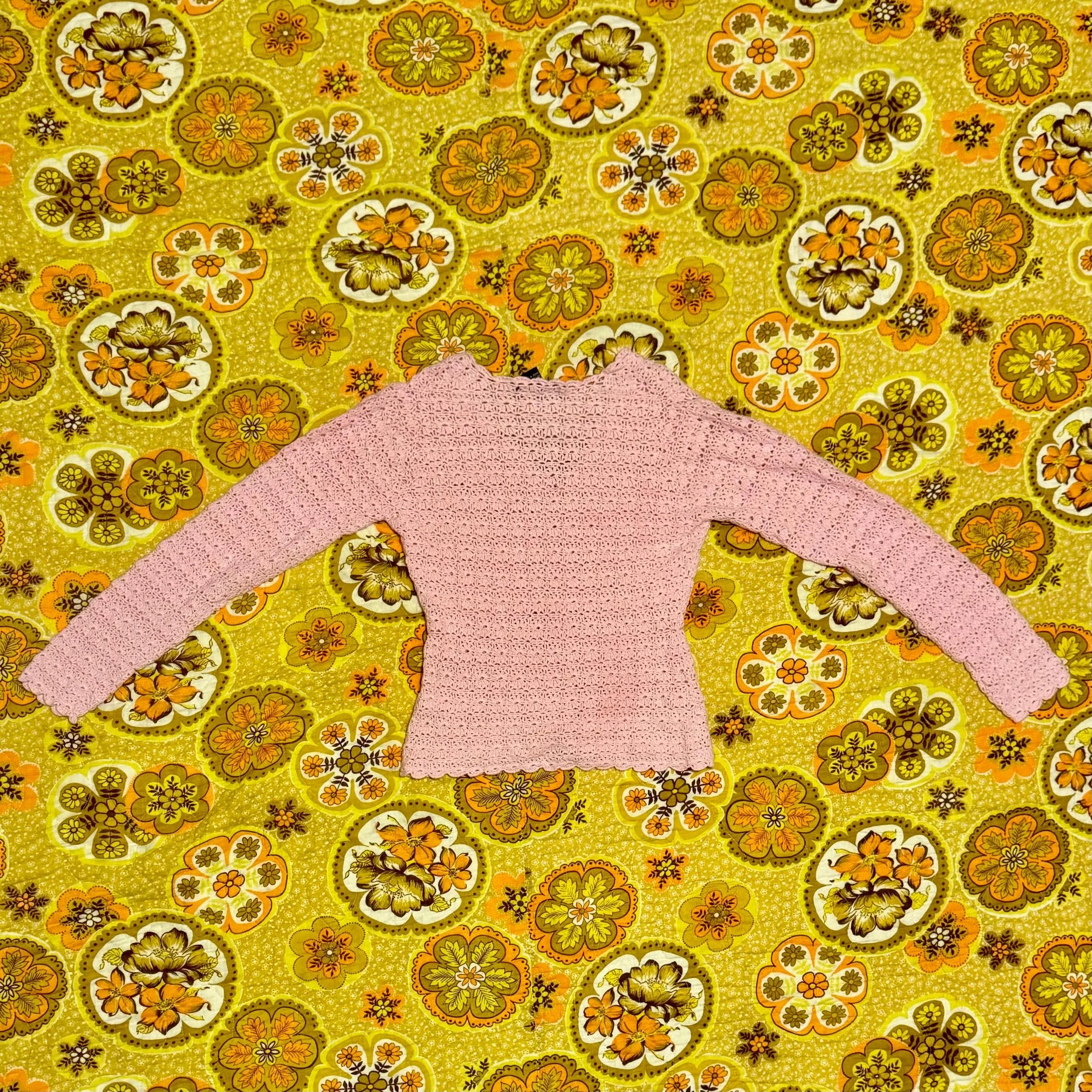 Such a cute little cardigan! This is a Karen Kane open crochet light pink cropped cardigan sweater. Great to throw on over a cute tank top or even use as a swimsuit coverup. It is well made and ready to go on many new adventures with you! This cardigan is in great condition with no stains or tears and minor wear from previous use. Grab this vintage sweater and style it your way!