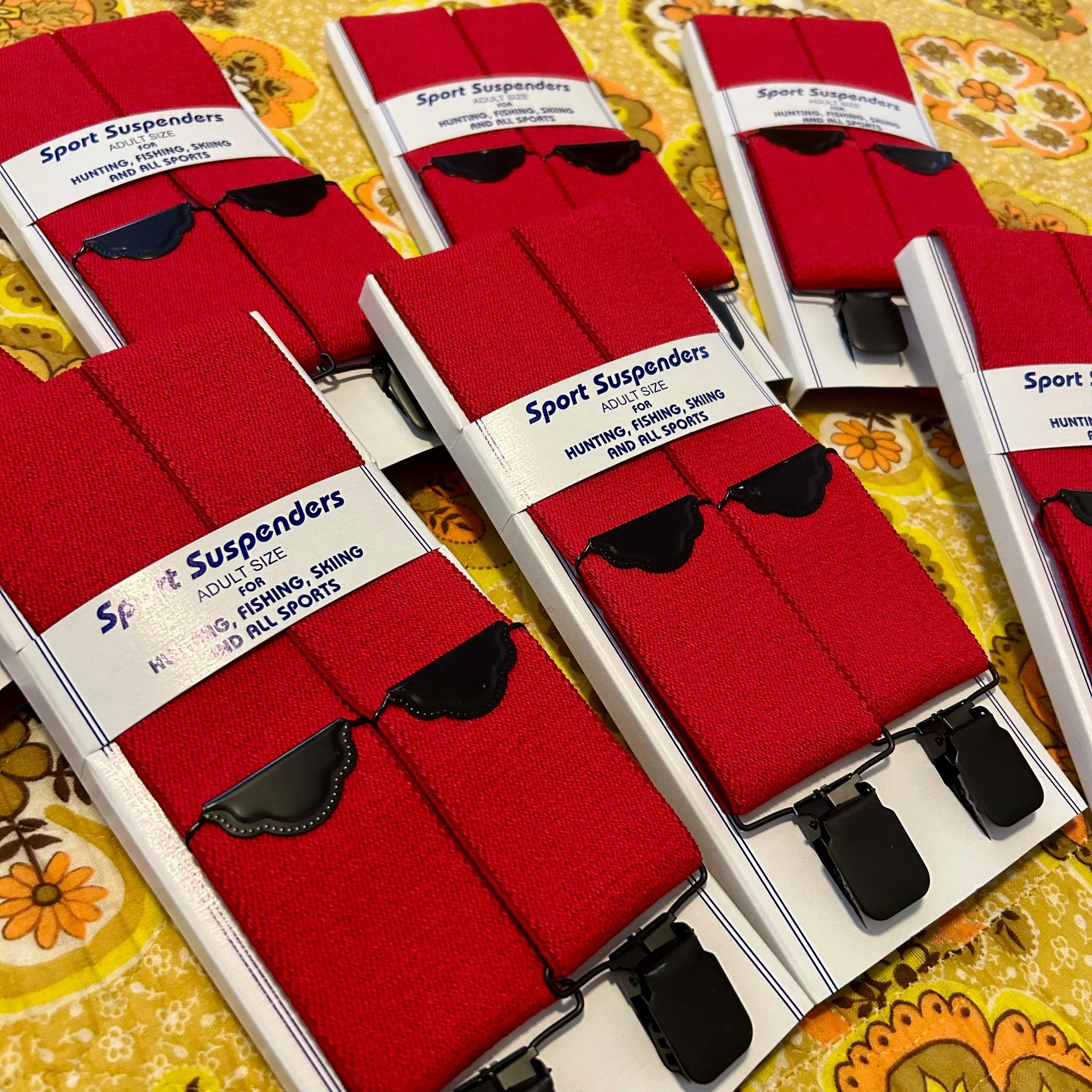 Looking for sports suspenders to keep you together while you ski, hunt, or fish? Then these are the perfect suspenders for you! Deadstock from the 1970s found at a closing business. These are brand new and never been opened or worn. Great for the vintage sports lover in your life, or for yourself. We've even tested them at home and they work great! They are one size for adults and can fit men or women. They come in a nice true red color and are made of stretchy comfortable elastic. Grab them for a stocking stuffer or ad them to your ski bag today!