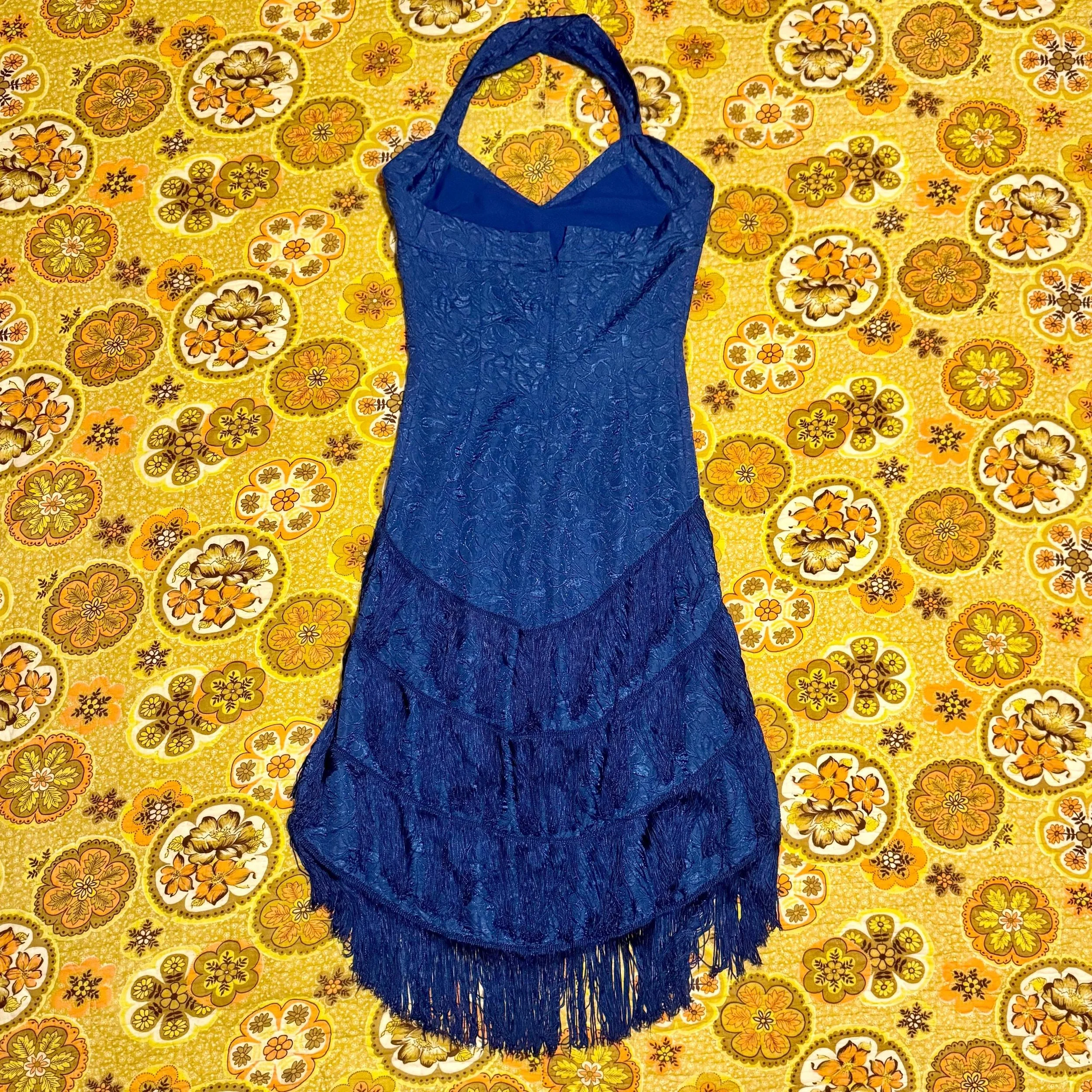 Going to a tea or 20s party and need a fun dress to accompany you? Look no further! This is a cute handmade bright royal blue floral lace flapper style dress with fringe. It is a bodycon style with a v-neck, halter neck strap, and high-low effect. It looks to be handmade but well done and still can be worn many times. It has no stains or tears. Grab this lovely dress and take yourself back in time!