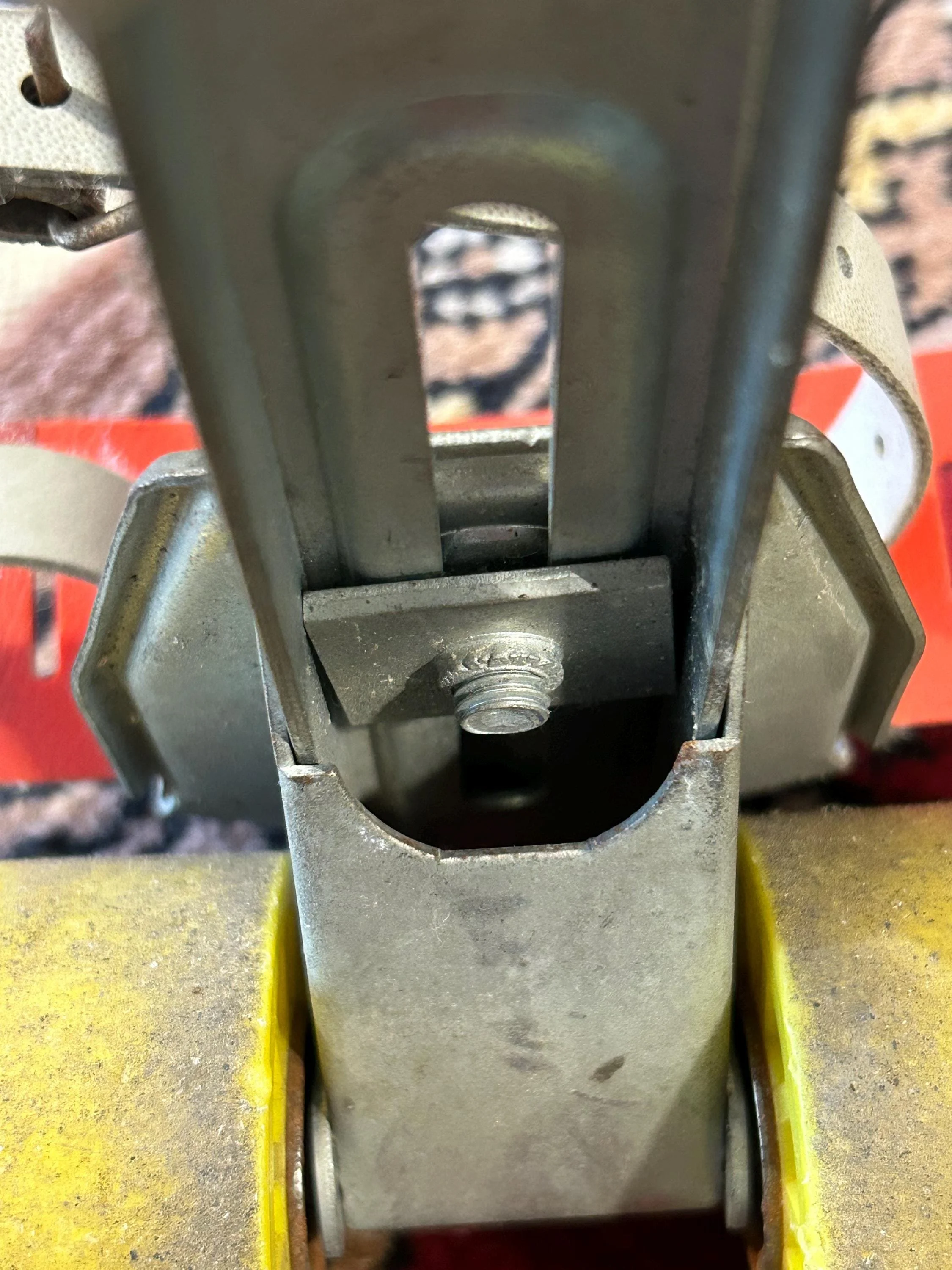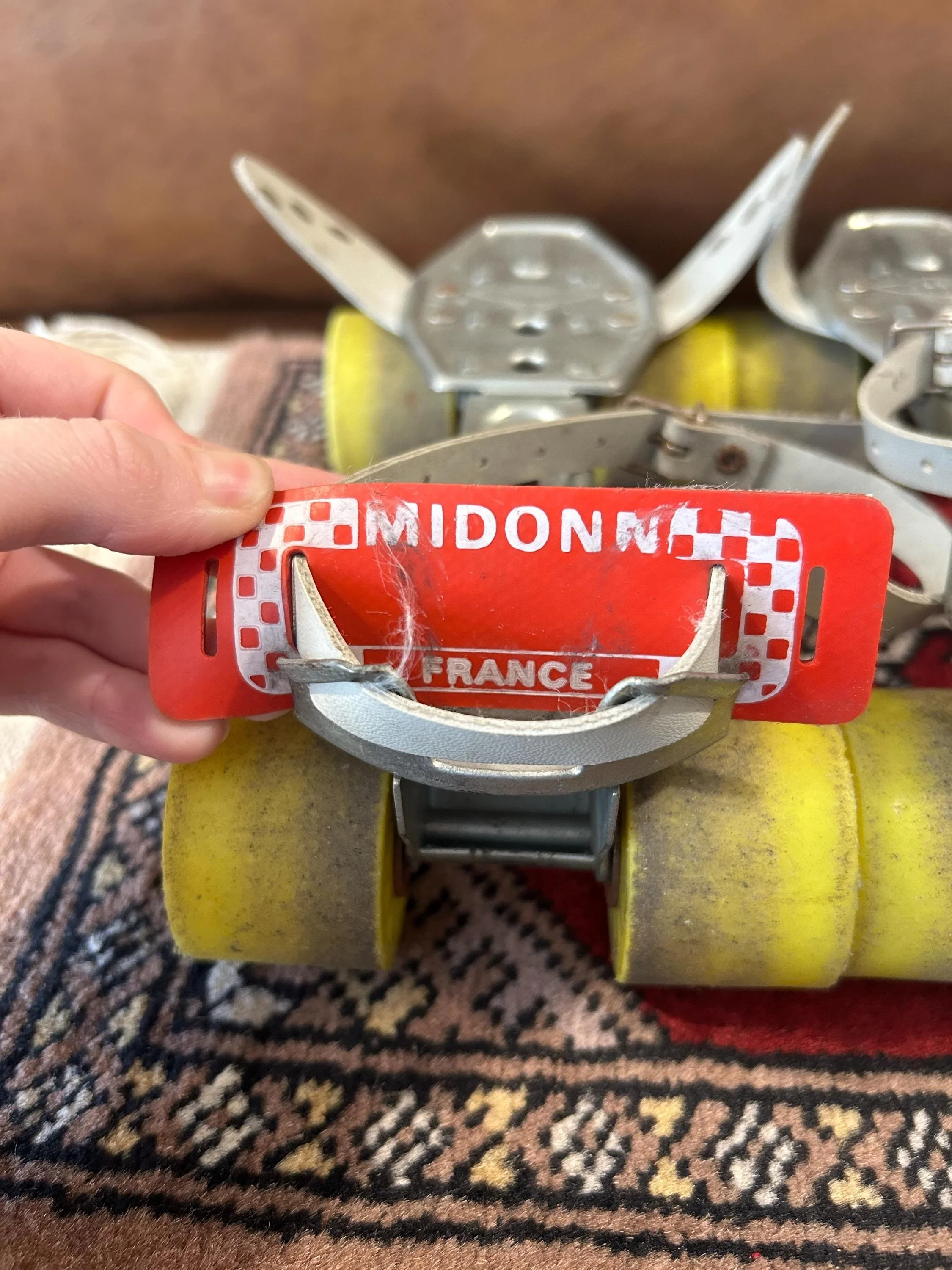 This is an amazing vintage pair of tie on roller skates made by Midonn. Most likely from the 1960s or 1970s and made in Paris France, these are in great condition for their age. The construction and metal is sturdy and these can still be used. These skates are adjustable as well, you can loosen the bolt and slide the heel of the skate up or down. There are no laces on the front of the skates but you can easily add in whatever color you would like. The leather for the ankle straps and toes is white, there is a red rubber Midonn logo on the ankle, and the wheels are a bright yellow colors.