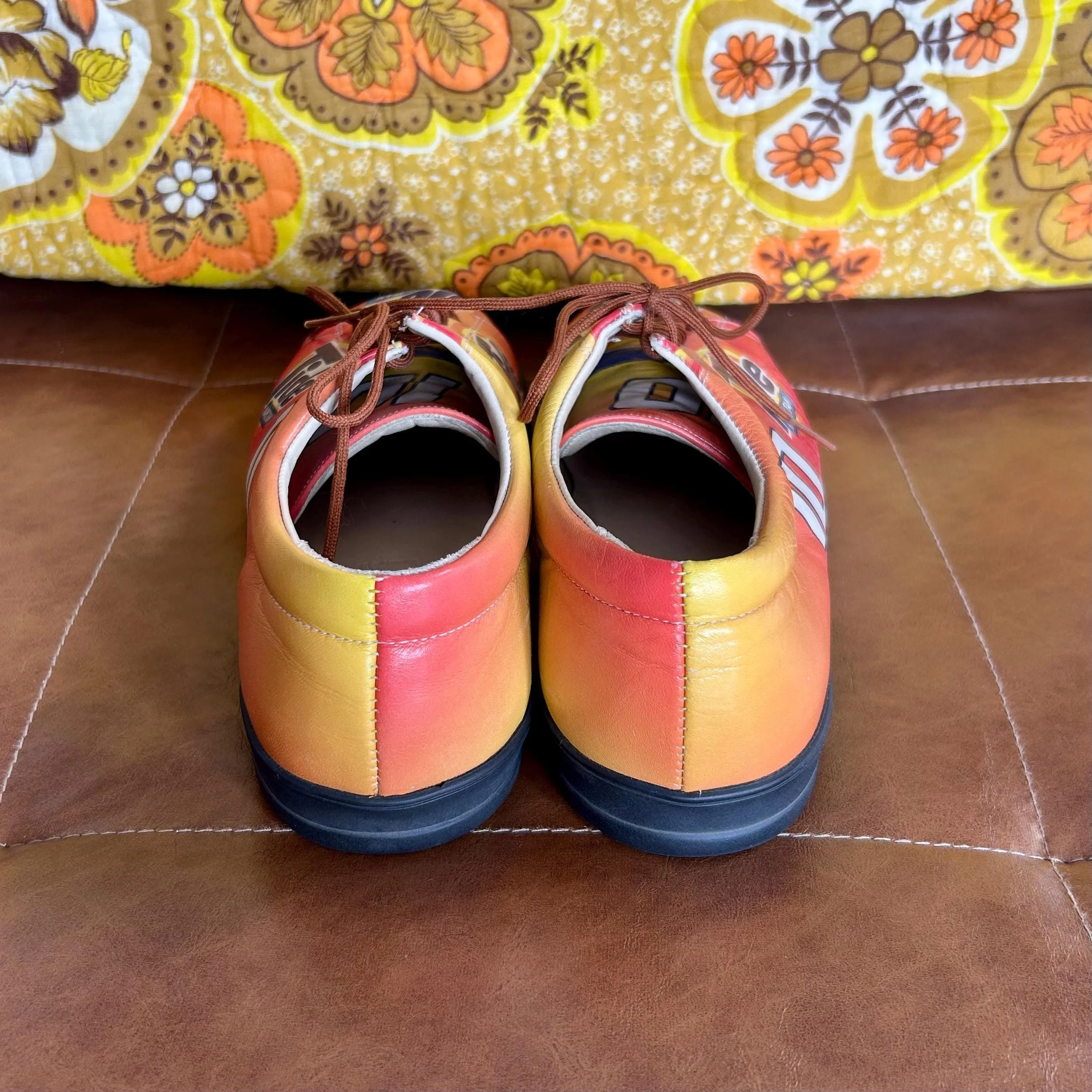 Get ready for a pit stop with these 1994 Nascar Ricky Rudd #10 Tide shoes! They are unisex and could fit a men's size 6.5 or a women's 8.5. The main material of the shoes is leather and they are overall in great condition with only a minor scuff on the right toe as seen in pictures. The colors are bright & attention grabbing, the laces are working and not worn, & the soles are in great condition.